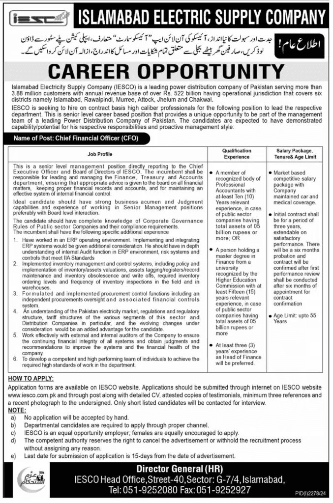 Islamabad Electric Supply Company (IESCO) is a leading power distribution company in Pakistan. IESCO oversees operations across six districts: Islamabad, Rawalpindi, Murree, Attock, Jhelum, and Chakwal. IESCO invites applications for the high-level role of Chief Financial Officer (CFO) on a contract basis. This is a senior leadership position, providing a unique opportunity to be part of the management team in one of Pakistan’s leading power distribution companies. The ideal candidate must demonstrate strong business acumen, leadership capabilities, and a proactive management style.